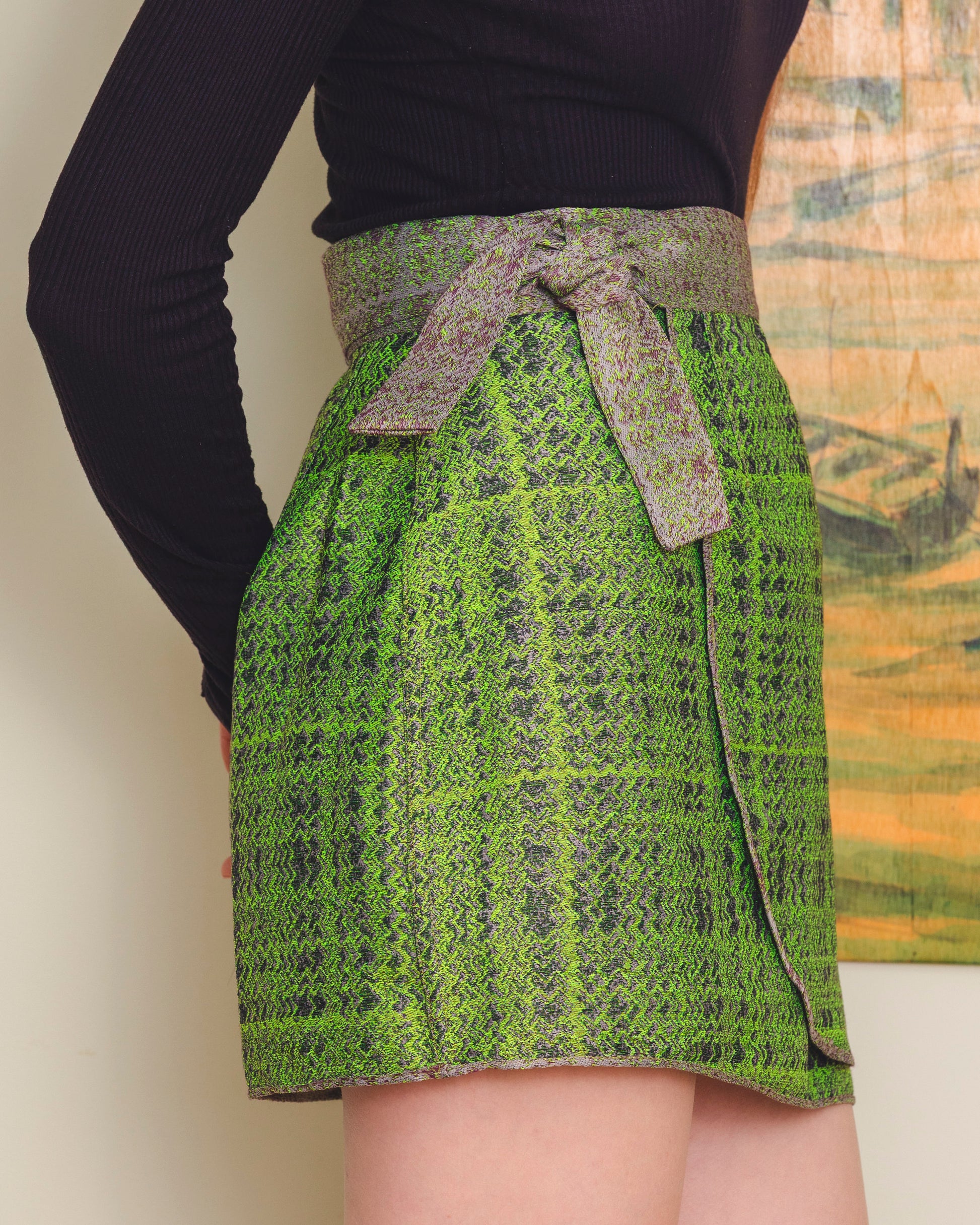 A short wrap double-face skirt with intricate detail made in a beautiful grey & green wool jacquard. The skirt is carefully crafted and can be considered the perfect short skirt for the season.