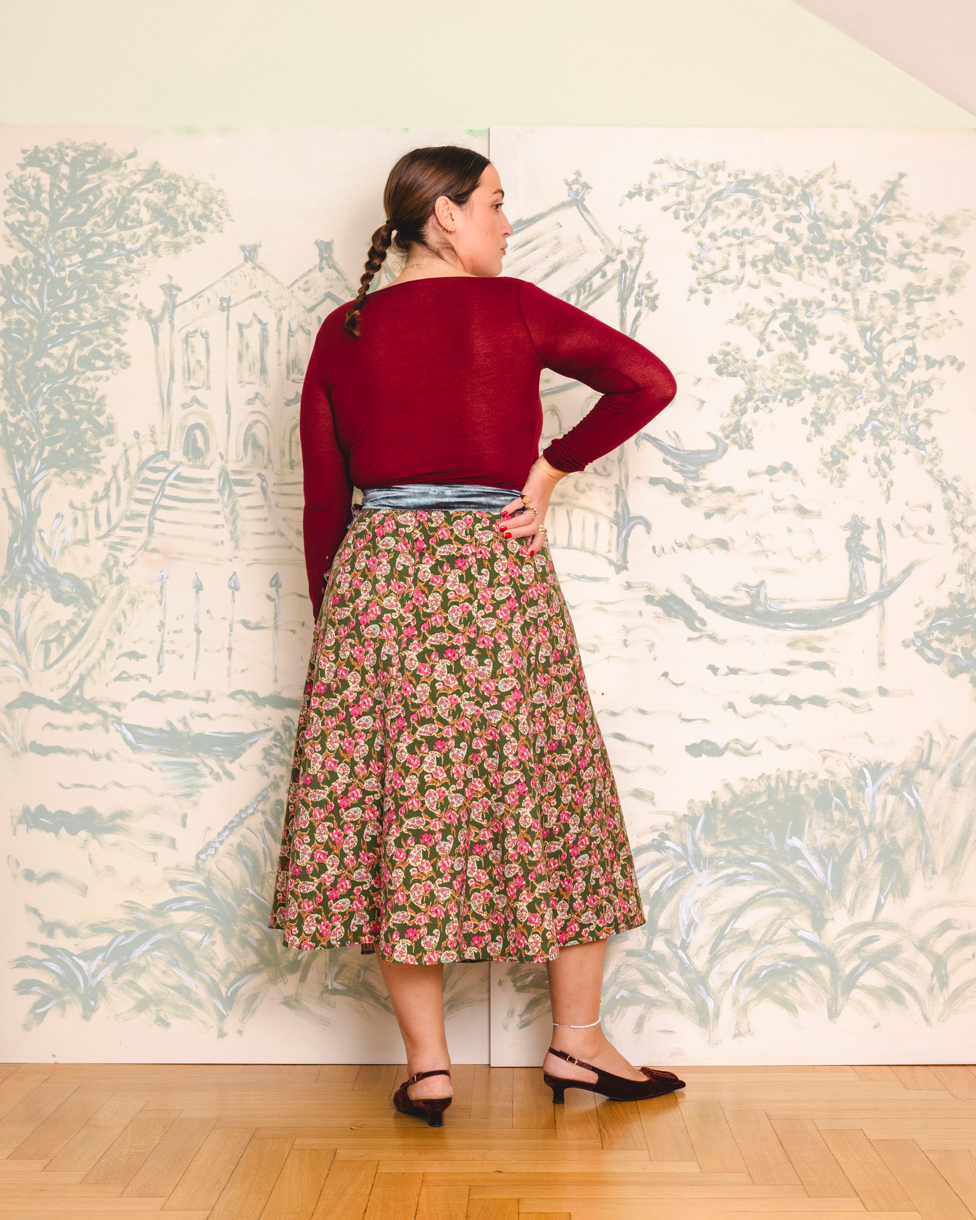 This wrapped skirt with an adjustable waist offers the freedom to personalize your look. Craft to have extra volume and movement towards the end, giving your outfit a lively and dynamic flair.