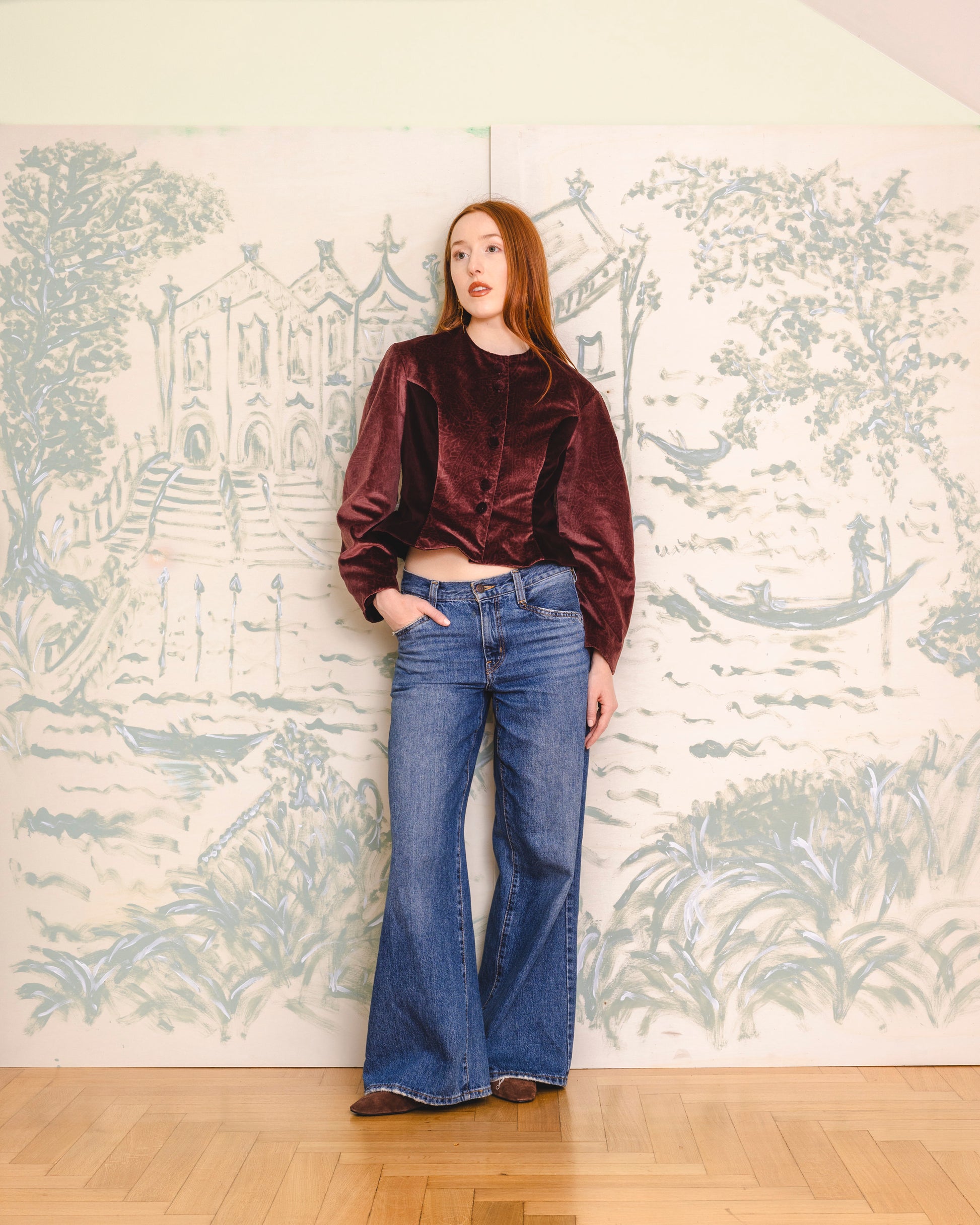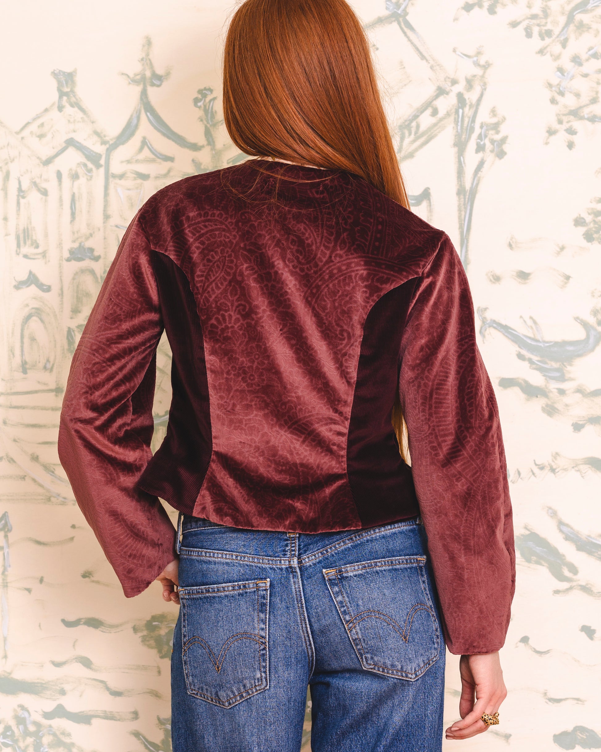 Crafted from a mix of luxurious velvets - one corduroy and the other adorned with a laser etched floral design - this jacket is a must-have for your wardrobe. Featuring a round neckline and a button opening on the front with fabric covered buttons, it follows the curves of your body and ends in a playful godet hem. Lined with our iconic toile de jouy, it adds the perfect finishing touch.