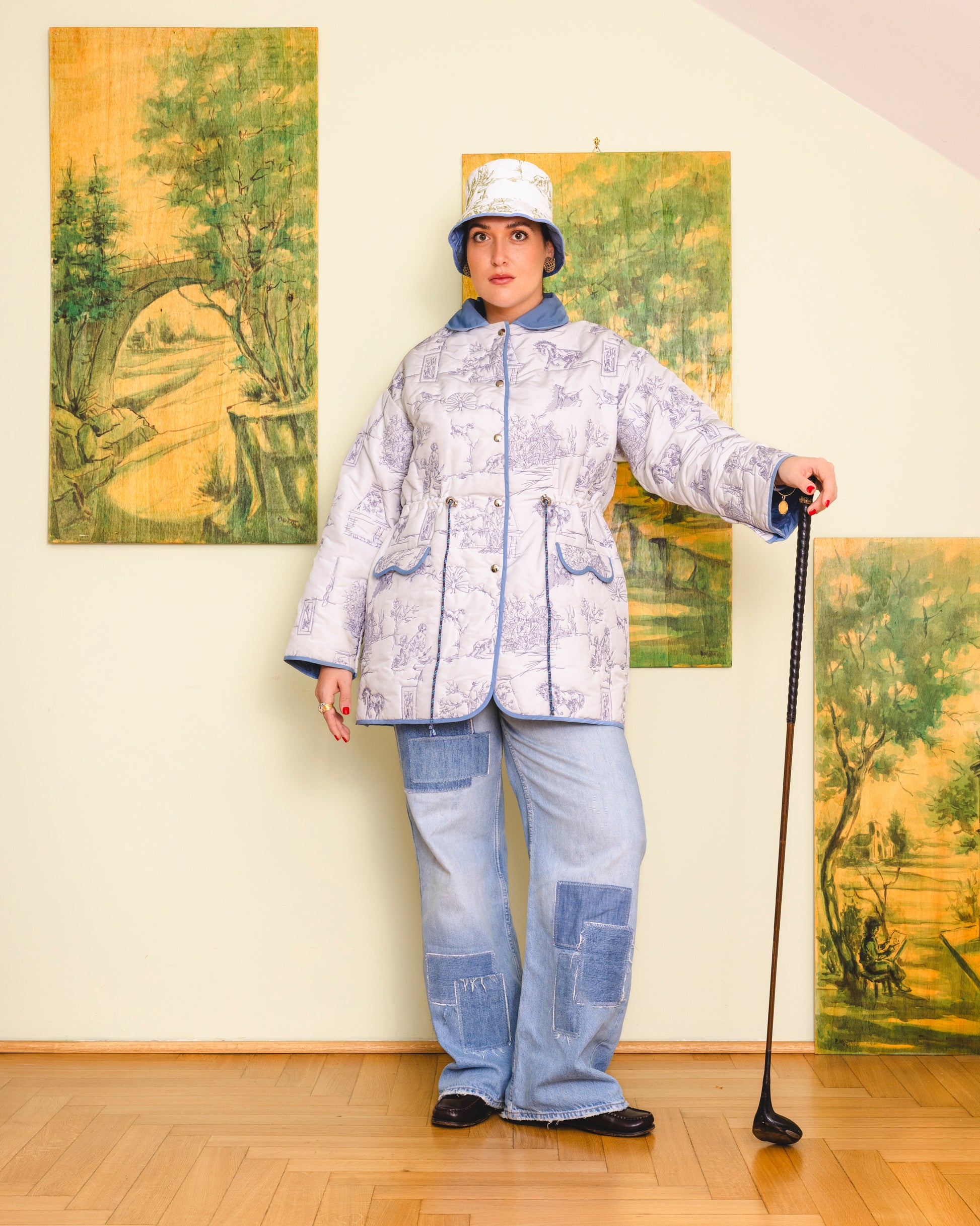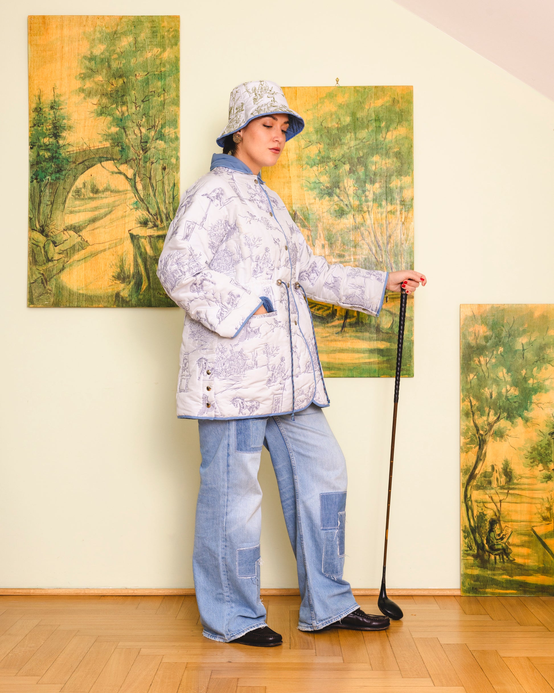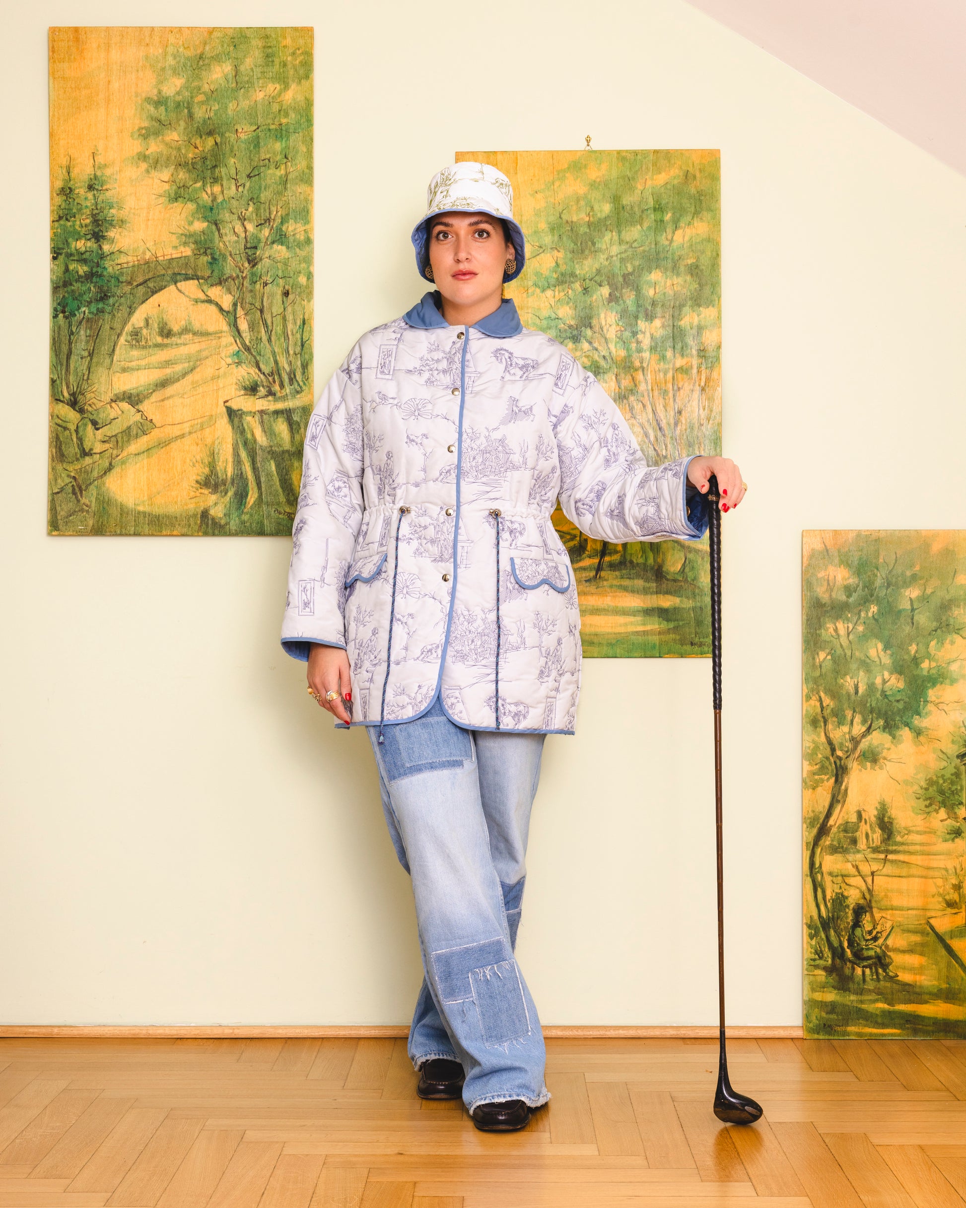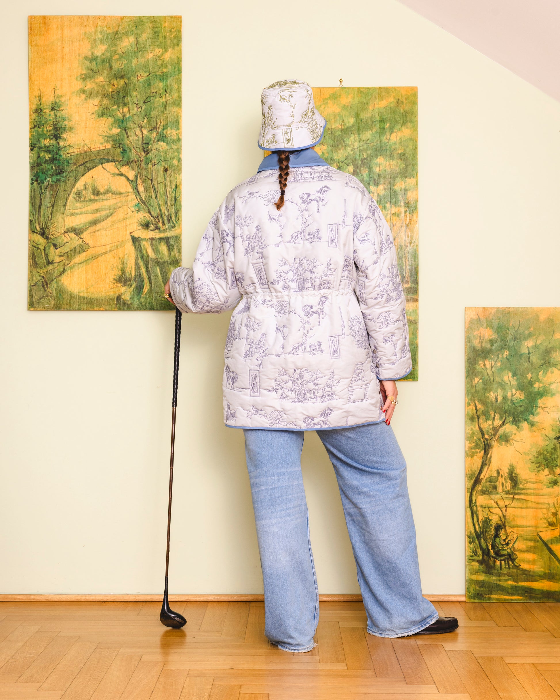 Made in our unique toile de jouy matelassé, it is the perfect addition to your wardrobe, offering both functionality and style. The jacket has a button opening, wave detailed front pockets as well as draw string features in the waist.