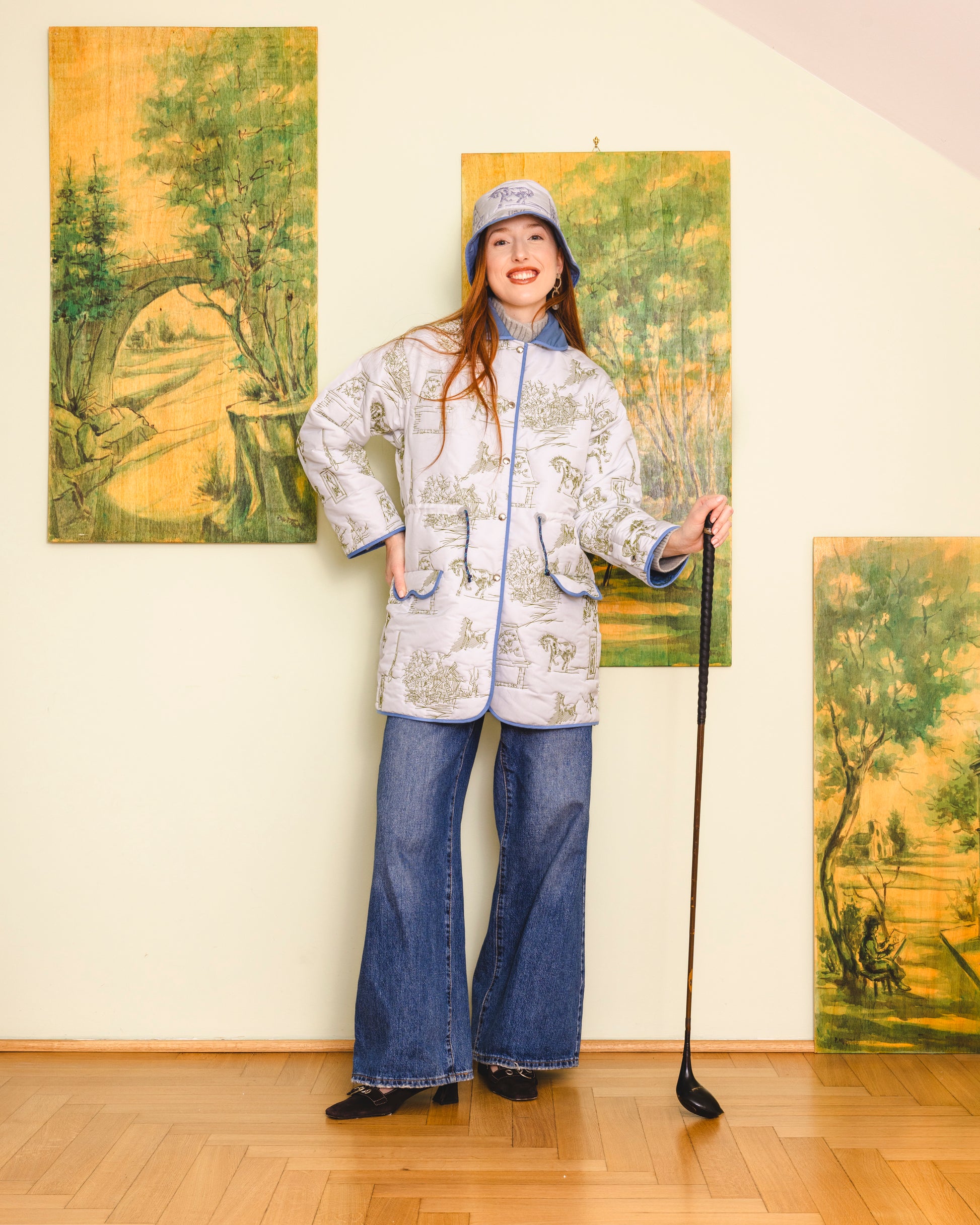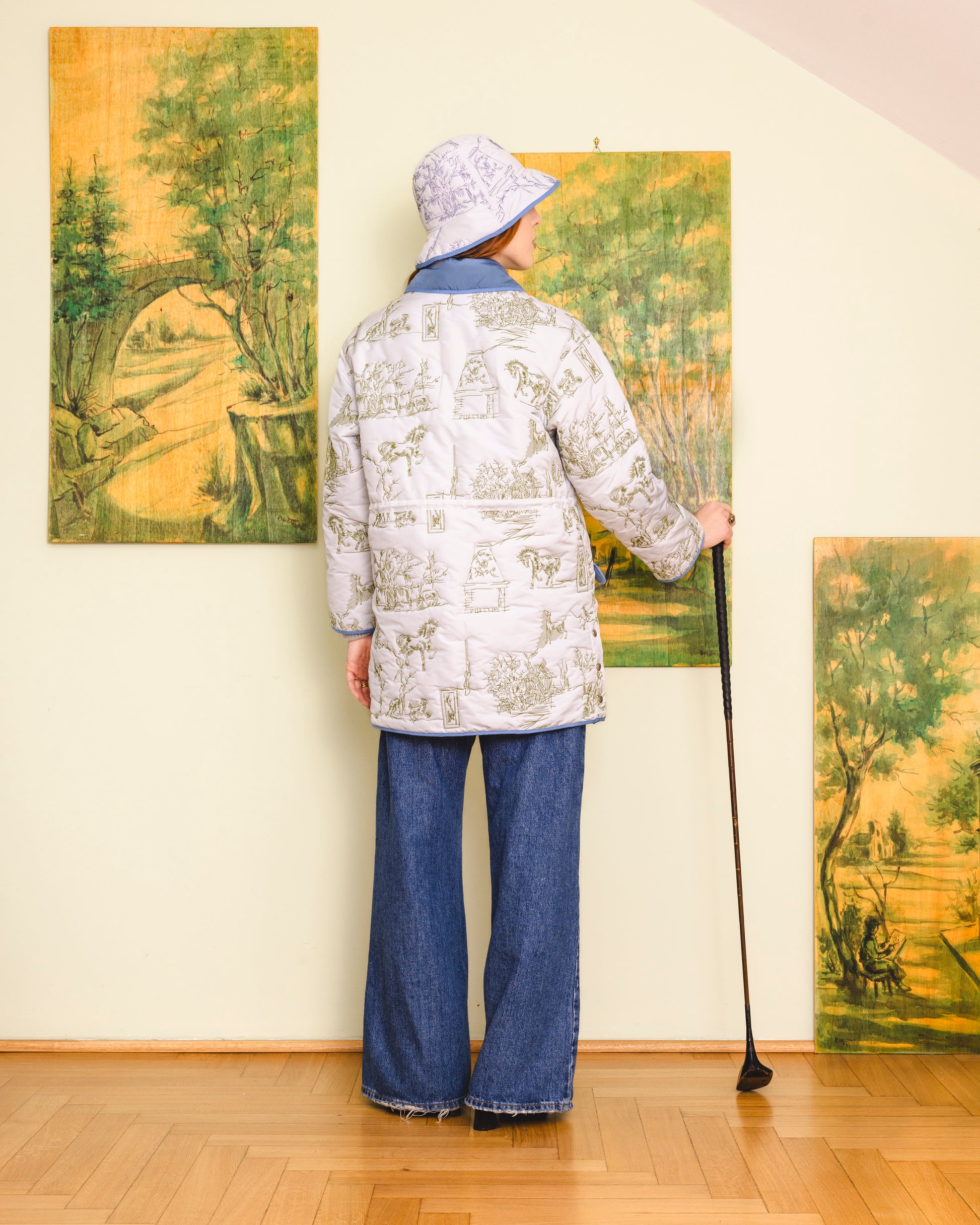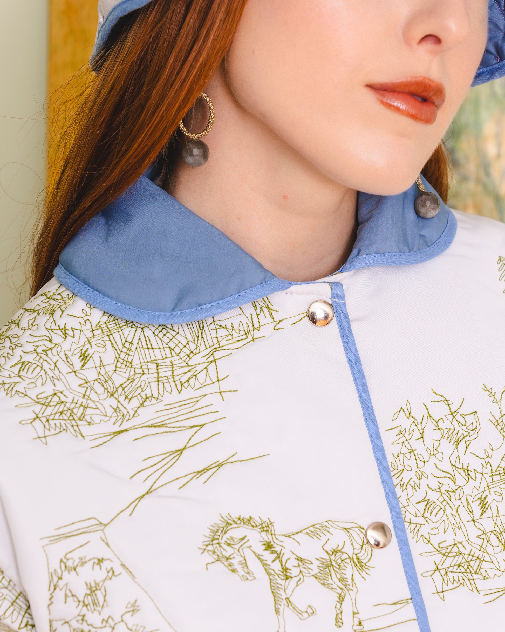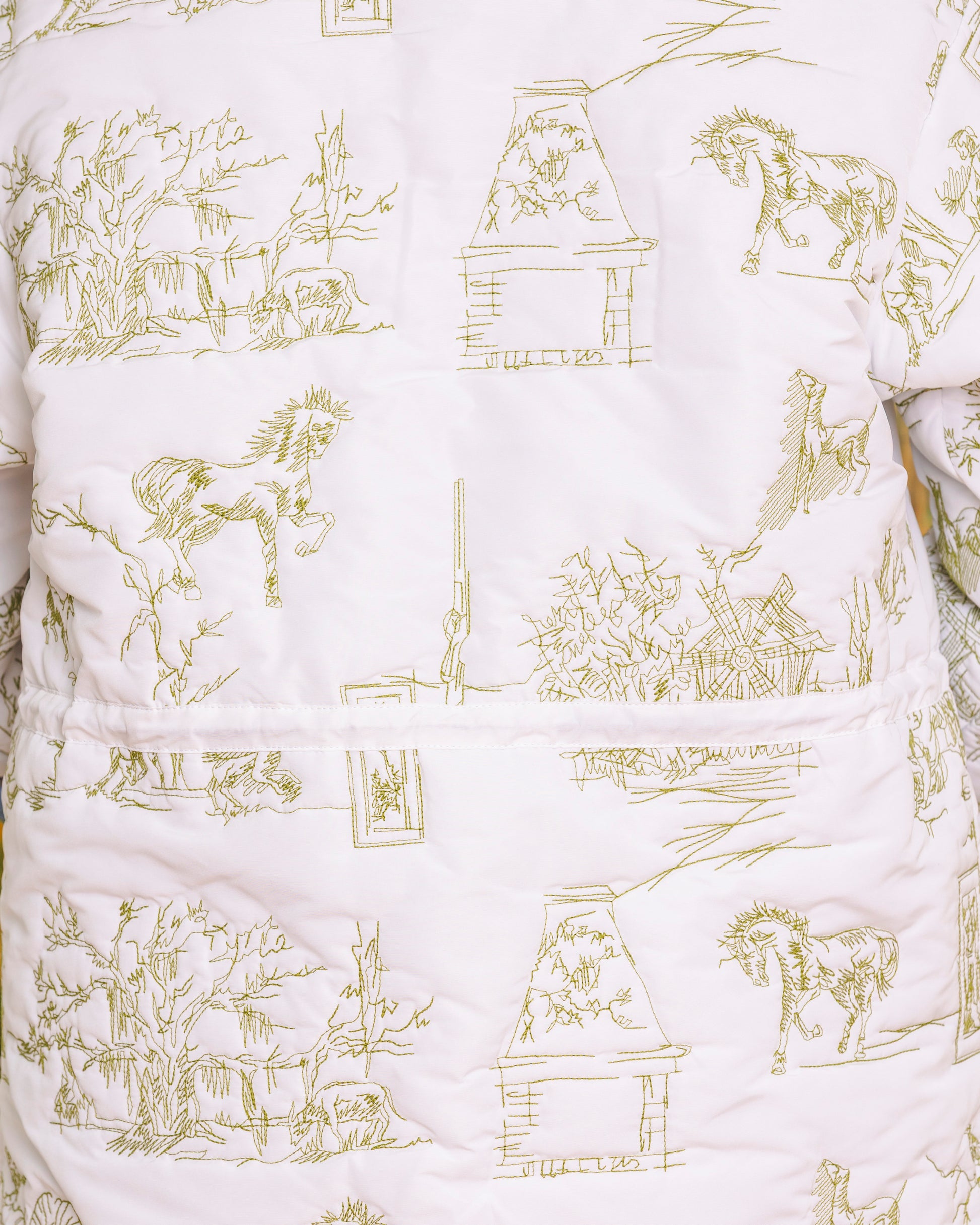 Made in our unique toile de jouy matelassé, it is the perfect addition to your wardrobe, offering both functionality and style. The jacket has a button opening, wave detailed front pockets as well as draw string features in the waist.