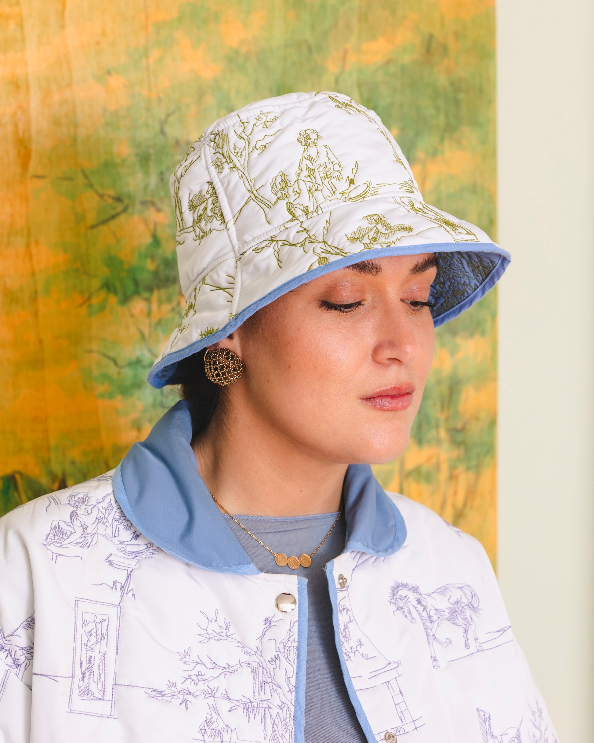 Our bucket hat is made in our unique toile de jouy matelassé print adding a touch of vintage charm to your look.