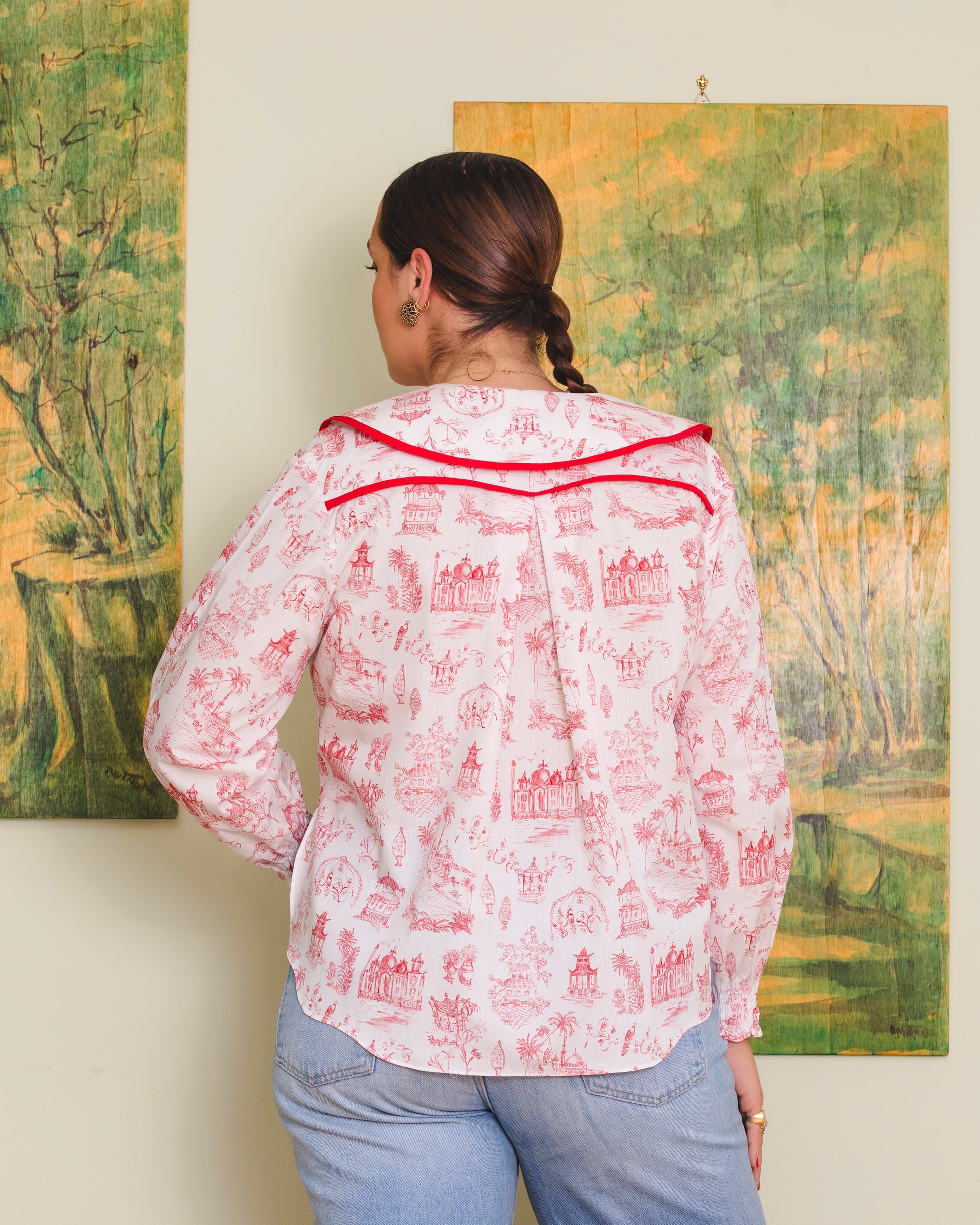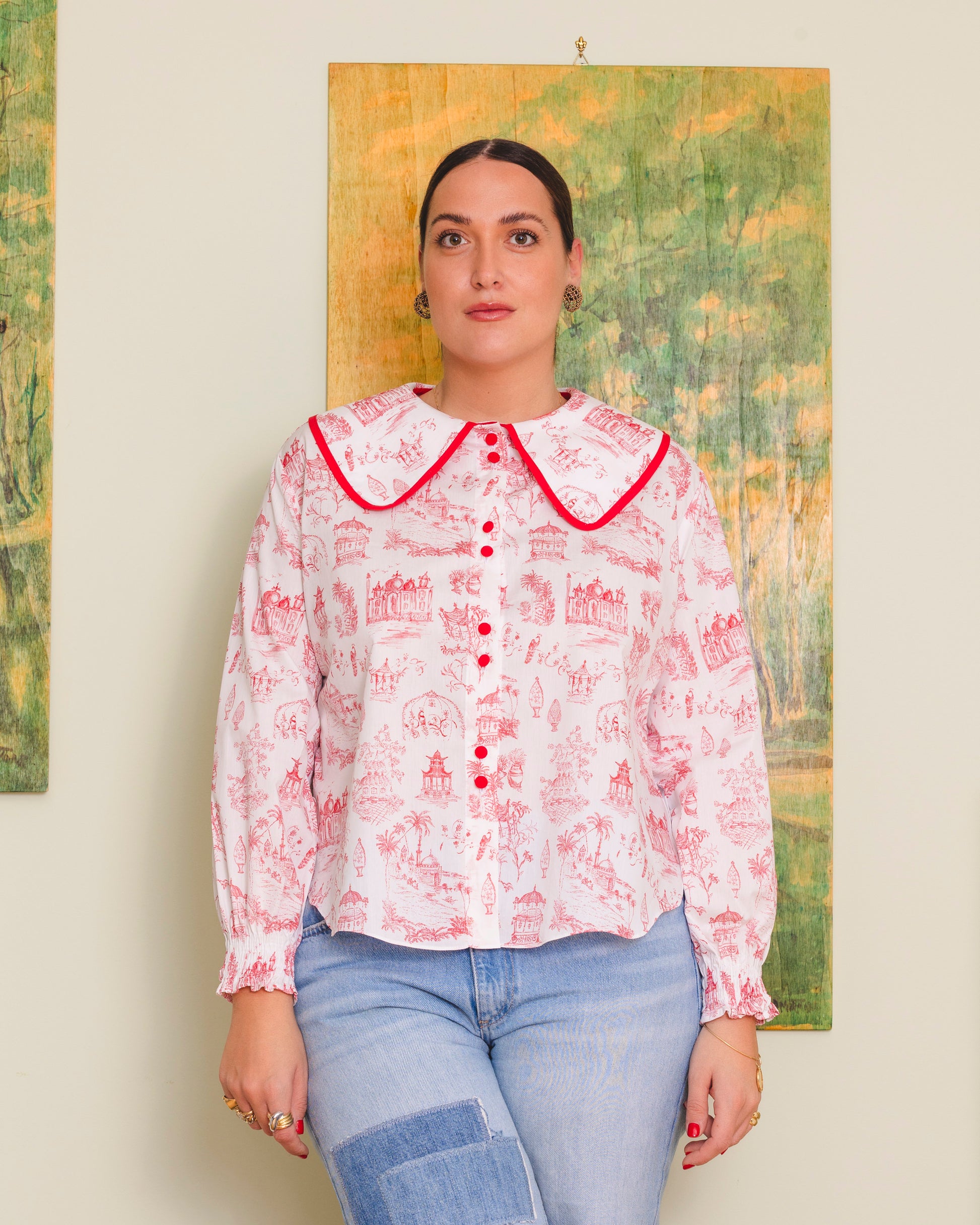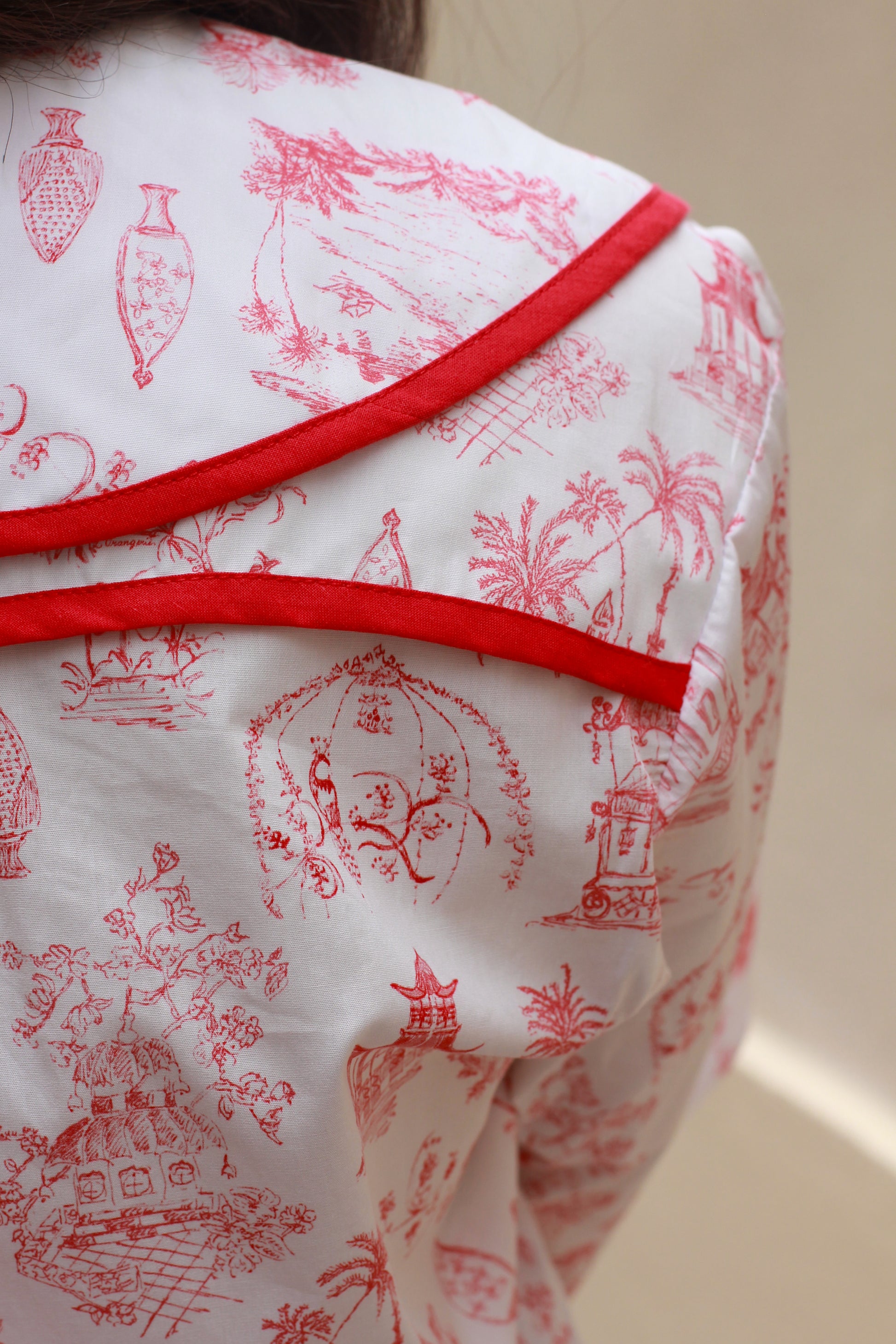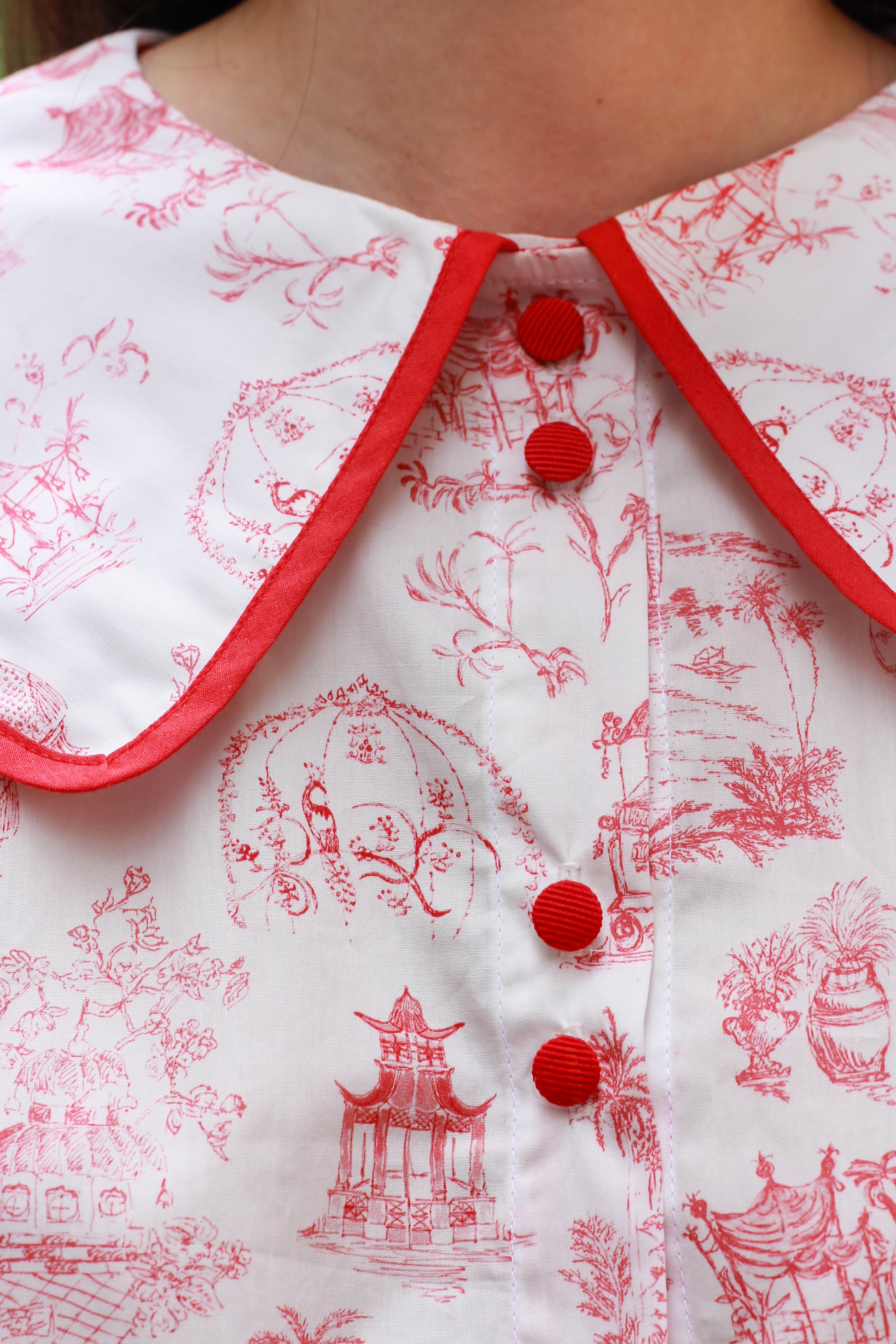 A very special version of the Solea shirt made in our new Voyage print in red! This lightweight cotton shirt features a relaxed, oversized fit with romantic balloon sleeves finished with elastic smock cuffs. The rounded collar and back yoke are finished with matching bias, adding subtle structure and charm. Fabric-covered buttons complete this effortless everyday piece.