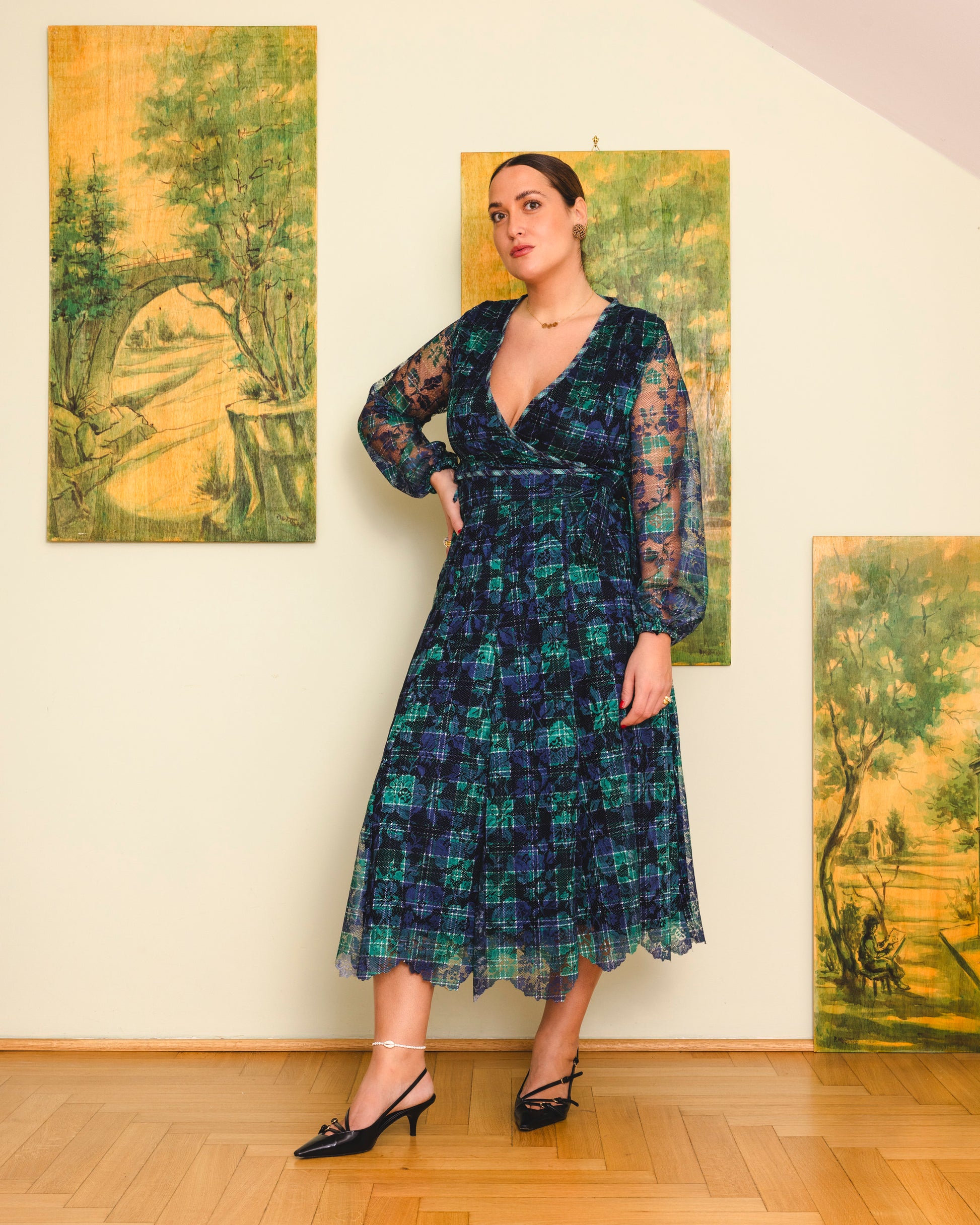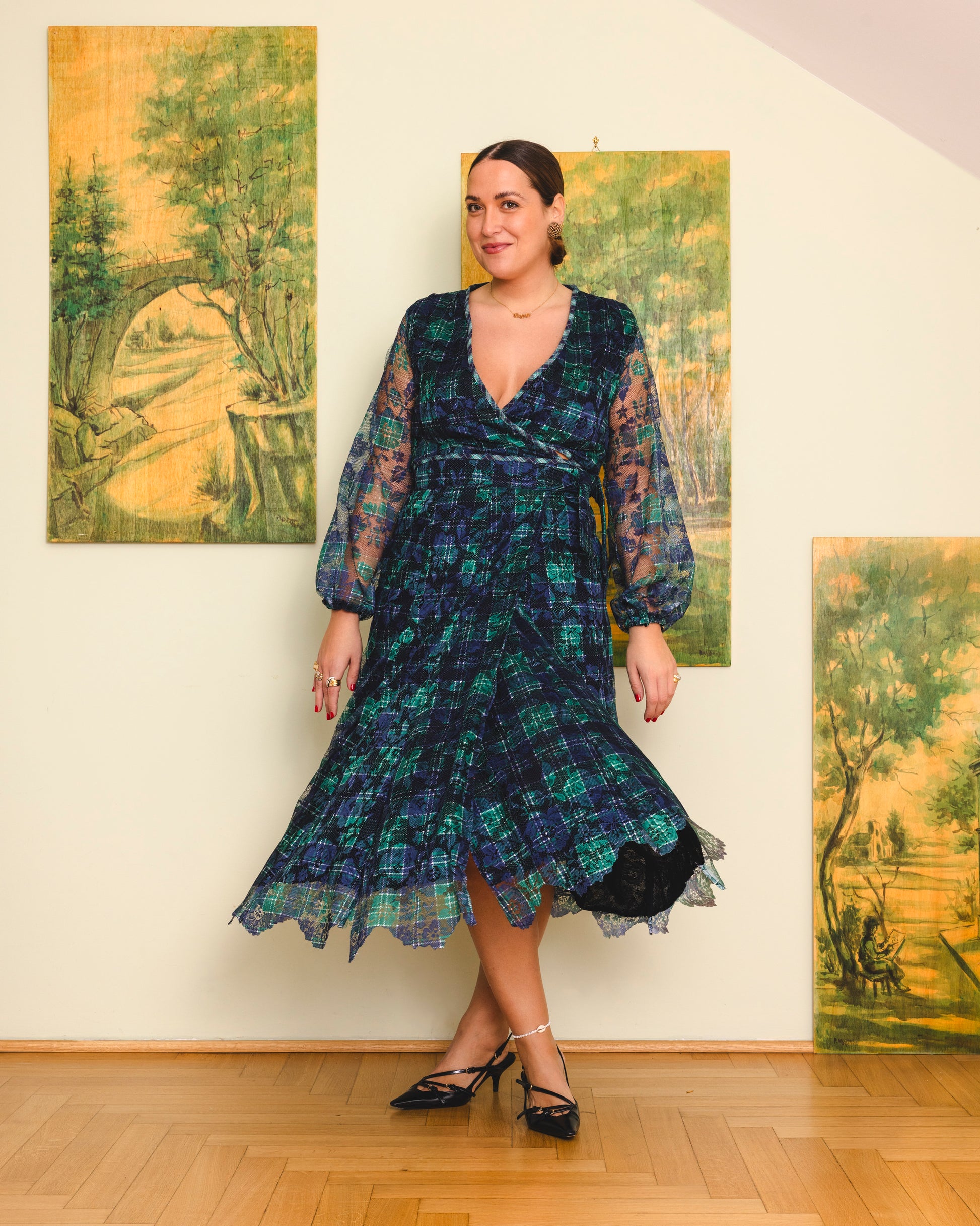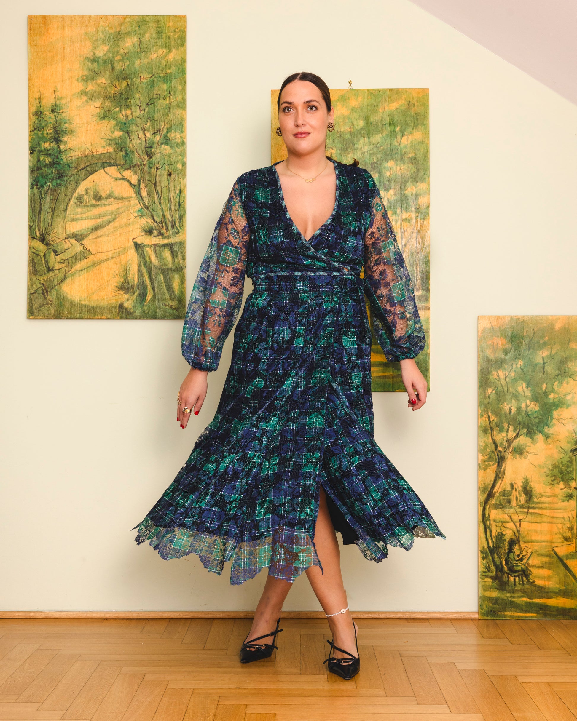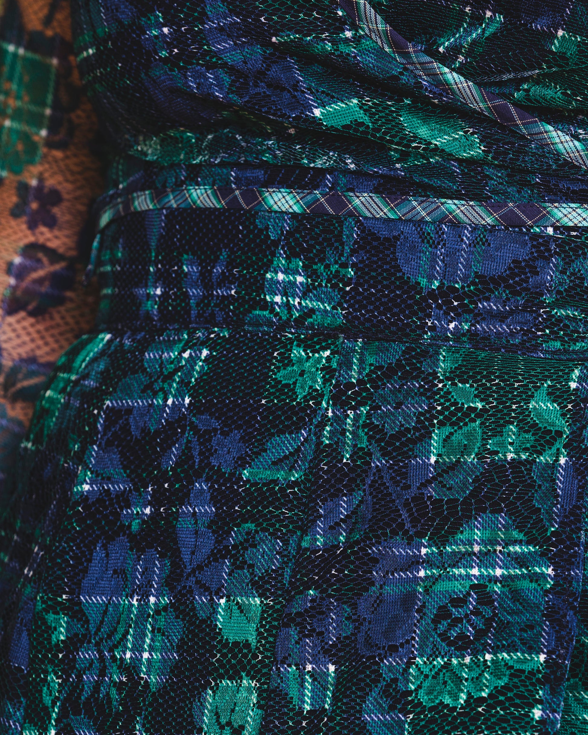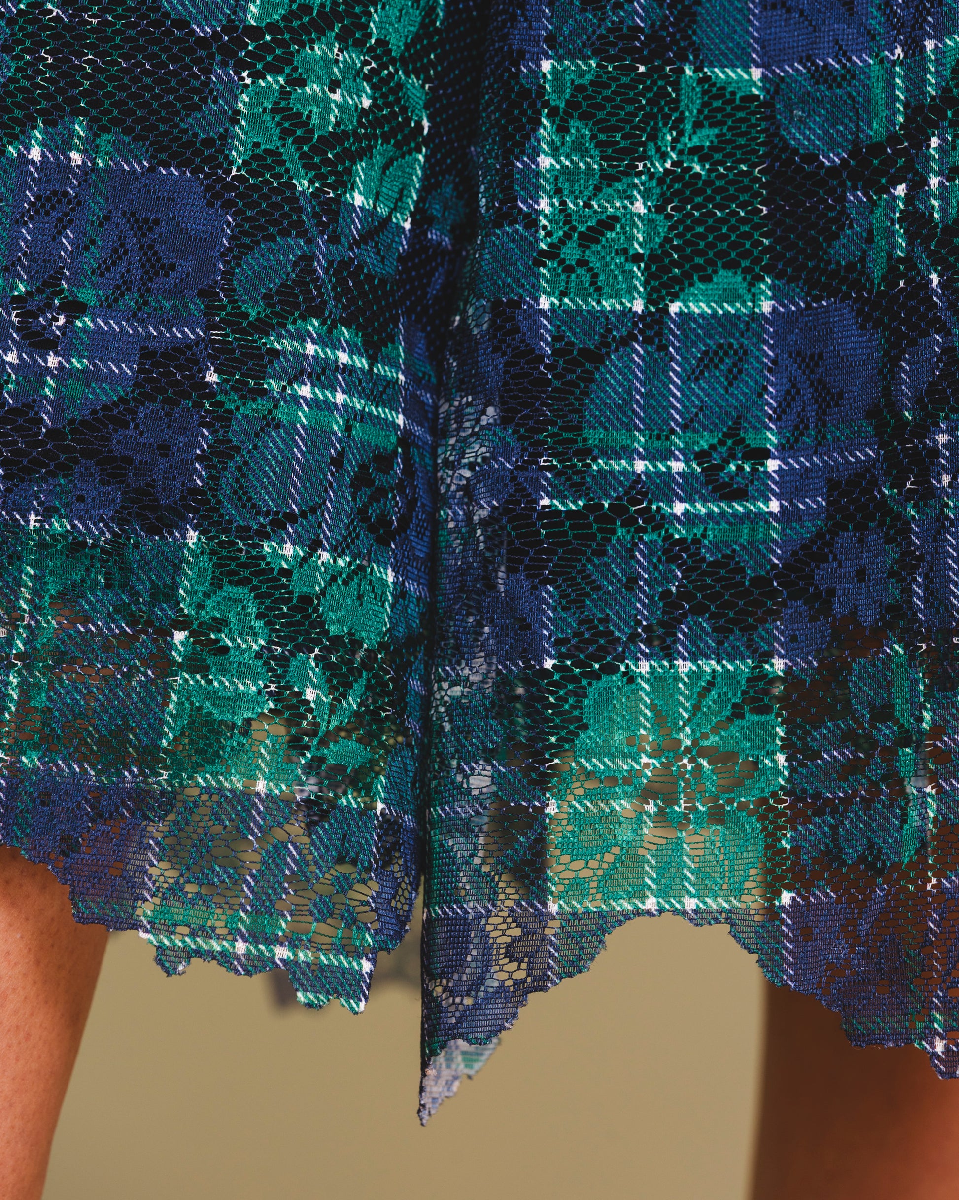 Elevate your style with this graceful set, featuring a ballet-inspired wrap top crafted from tartan lace layered over green viscose and a wrap skirt with an adjustable waist. The top’s delicate design pairs effortlessly with the skirt’s extra volume and lively movement at the hem, offering a personalized fit and dynamic elegance. Perfect for creating a chic, adaptable look for any occasion.