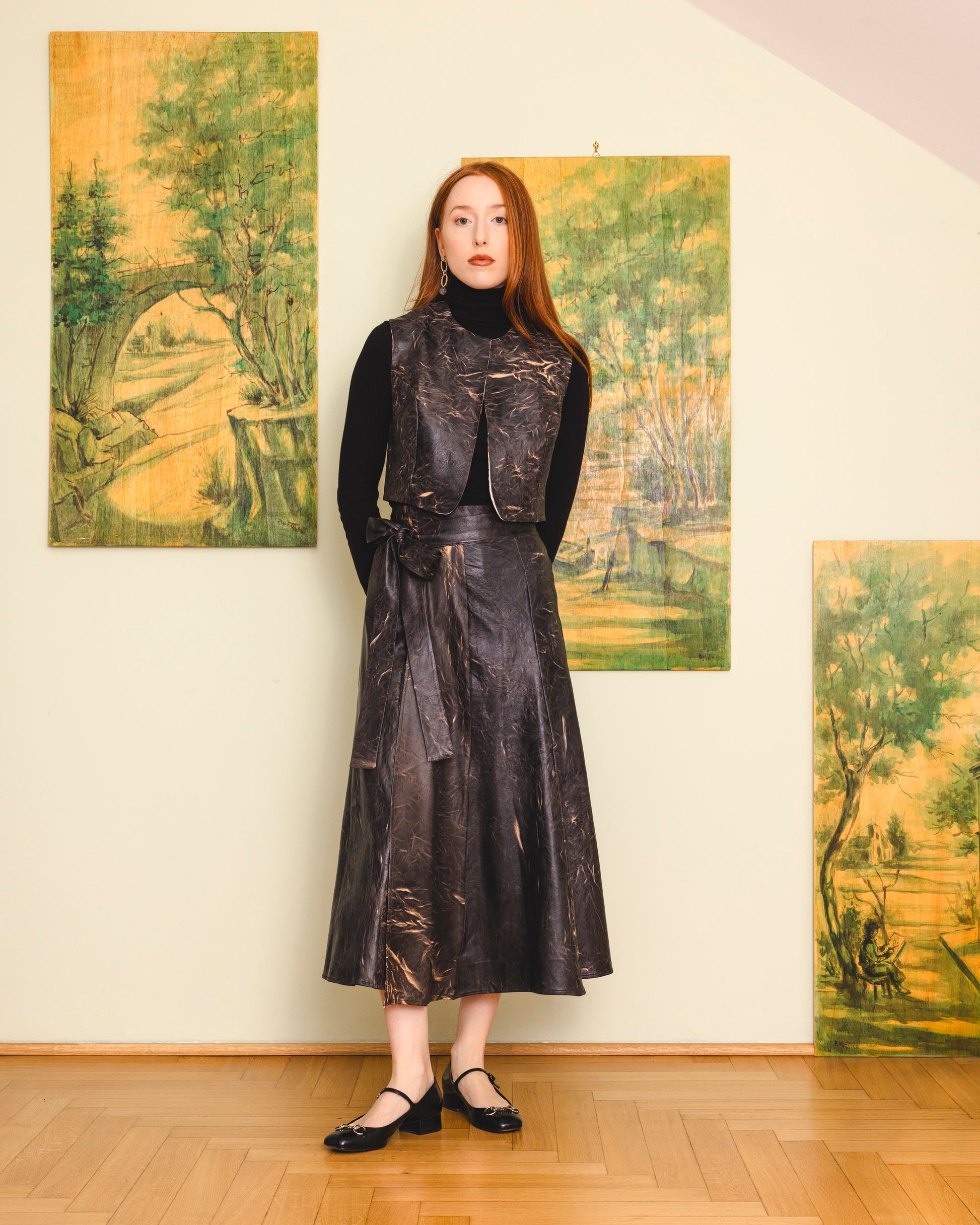 The Uva Button-Up Vest is a modern wardrobe essential. Featuring a round neckline, and flattering princess seams, this sleeveless leather top offers effortless versatility. Ideal for layering, pair it with the Uva Skirt for a casual look or over a dress for an elegant appearance. Lined with our iconic Toile de Jouy, it’s a sophisticated yet simple piece for any occasion.